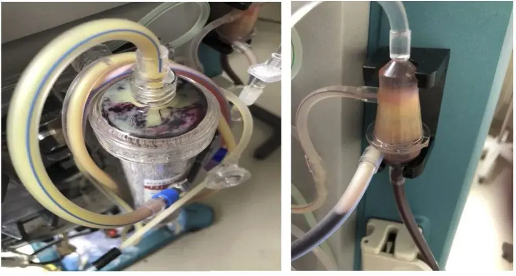 Se observó una sustancia lipídica en el circuito que causaba obstrucción en el sistema de diálisis y en los circuitos de la membrana de oxigenación extracorpórea (ver figura).