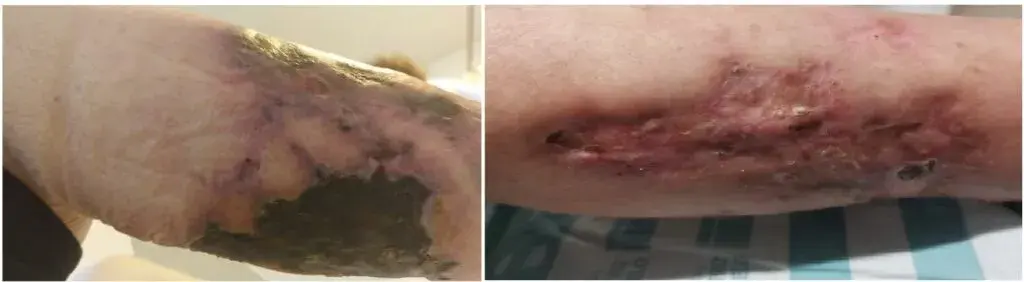 La primera imagen muestra múltiples placas con livedo y úlceras circulares con escara necrótica adherida. La segunda imagen muestra una evolución favorable.