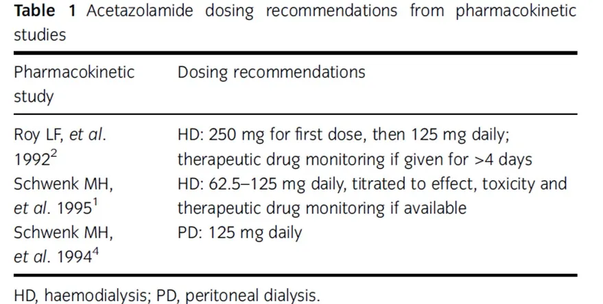 Caso seja imprescindível o tratamento com acetazolamida em um paciente em diálise, devemos ter atenção especial para a redução da dose, além de manter vigilância ativa quanto aos sinais de intoxicação. Esse risco é especialmente maior em pacientes idosos ou aqueles que utilizam salicilatos.