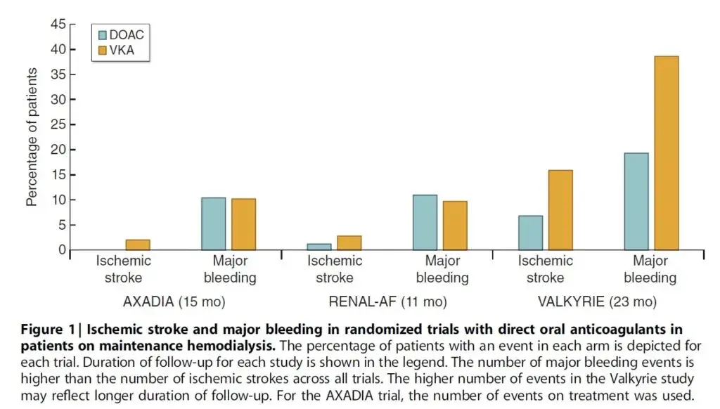 O [**RENAL-AF**](https://www.ahajournals.org/doi/10.1161/CIRCULATIONAHA.121.054990) randomizou 154 pacientes em HD que possuíam FA não valvar com escore CHA2DS2-VASc ≥ 2, ou seja, maior risco de AVC. Os pacientes receberam apixabana (5mg 2xdia) ou varfarina (INR 2-3). Caso os paciente possuíssem > 80 anos ou tivessem peso < 60 kg recebiam uma menor dose de apixabana (2,5mg 2xdia). O estudo foi interrompido de forma prematura por dificuldade de recrutamento. Avaliando o seguimento de 11 meses a incidência do desfecho primário (sangramento relevante) não foi diferente no braço apixabana vs varfarina (31,5% vs 25,5%, HR 1,2 IC 95% IC 0,63-2,3). A taxa de eventos isquêmicos também foi semelhante 3,0% vs 3,3% entre os grupos
