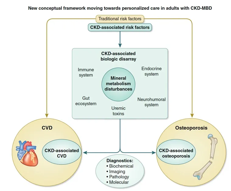 A DMO-DRC resulta dos efeitos individuais e combinados de fatores de risco tradicionais e específicos da DRC para doenças esqueléticas e cardiovasculares. Os fatores de risco associados à DRC incluem a interação entre distúrbios do metabolismo mineral, toxinas urêmicas e os sistemas imune, endócrino, neuro-hormonal e intestinal. Embora a doença cardiovascular (DCV) e a osteoporose associadas à DRC existam dentro do contexto maior dos sistemas cardiovascular e esquelético, a extensão de sua sobreposição ainda não é completamente compreendida.