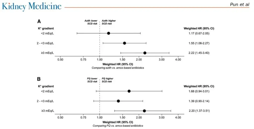 Este foi um estudo interessante que mostrou uma associação entre antibióticos que prolongam o intervalo QT (azitromicina/levofloxacino/moxifloxacino) com risco de morte súbita nos pacientes em hemodiálise. Este risco foi ainda maior em pacientes que apresentavam um maior gradiente de potássio (sérico-dialisato) ≥3 mEq/L.