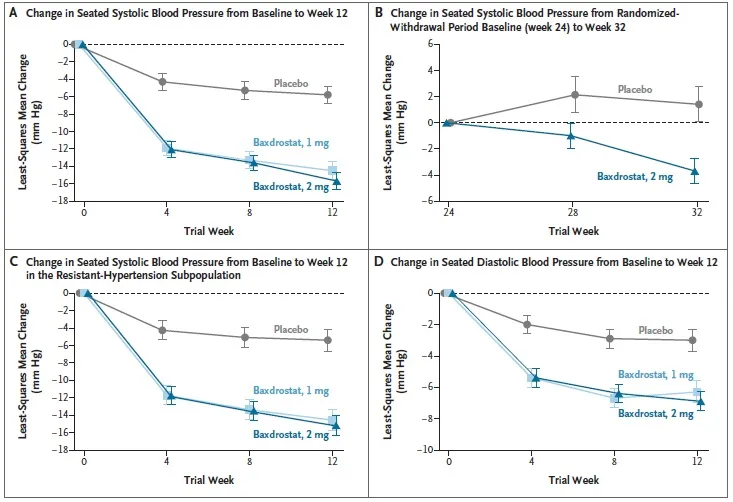 ✅ Baxdrostat reduziu de forma clinicamente significativa a pressão arterial em pacientes com hipertensão não controlada e resistente, com perfil de segurança aceitável.