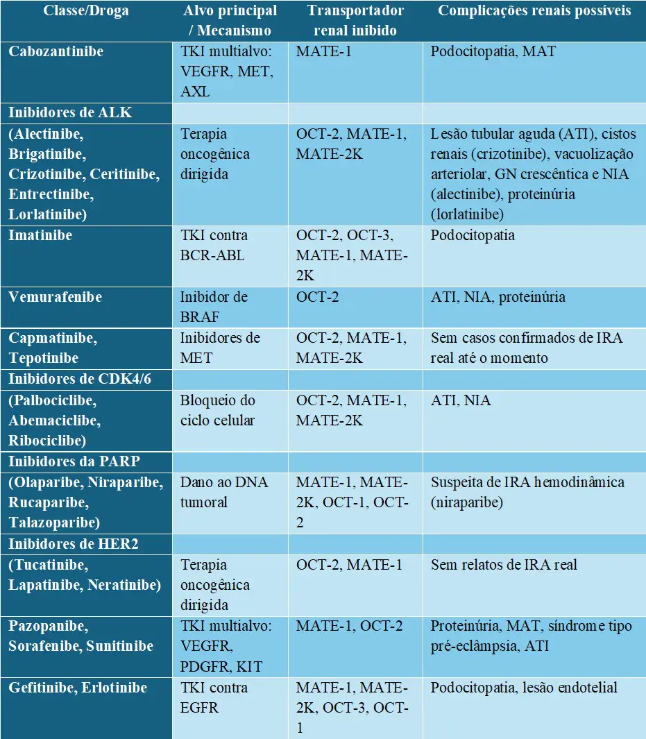 Algumas terapias-alvo, como os TKIs (inibidores de tirosina-quinase, ex: erlotinibe, sunitinibe) e os inibidores da PARP (poli-ADP ribose polimerase, como olaparibe ou niraparibe), interferem na secreção tubular de creatinina, simulando uma IRA. Isso é conhecido como pseudo-IRA. Nesses casos, a cistatina C pode ajudar, mas tem limitações.