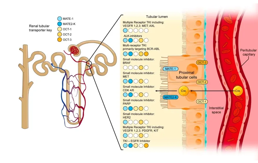 Os transportadores envolvidos na secreção de creatinina incluem OCT-1, OCT-2 e OCT-3 no lado basolateral, e MATE-1 e MATE-2K no lado apical. Os transportadores inibidos por diferentes classes de terapias-alvo contra o câncer estão representados na figura com codificação por cores; os transportadores bloqueados são indicados pelas cores atribuídas.