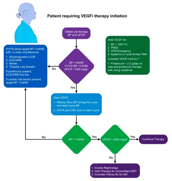 1️.Na presença de proteinúria inexplicada ou sedimento urinário ativo, recomenda-se envolver a nefrologia para considerar biópsia renal antes do início do VEGFi, a fim de tratar doença renal subjacente.
