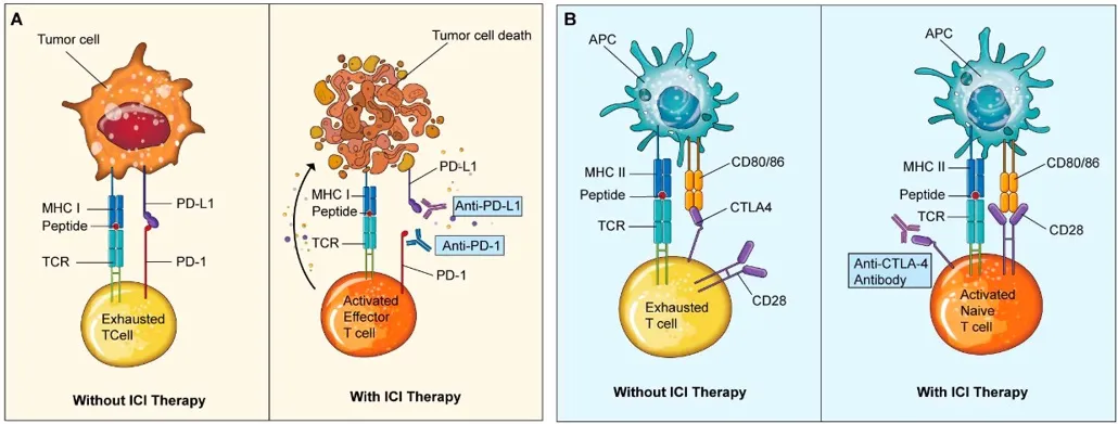Um dos mecanismos pelos quais células tumorais escapam do sistema imune é a expressão de PDL-1, o ligante do receptor PD1. Algumas células tumorais expressam PDL-1 de forma constitutiva. Os linfócitos T circulantes, após ativação, aumentam a expressão de PD1. A ligação entre PD1 e PDL-1 leva à exaustão dos linfócitos T, permitindo que as células tumorais evitem a citotoxicidade mediada por T. Os inibidores de PD1/PDL-1 bloqueiam essa interação, restaurando a atividade dos linfócitos T contra o tumor.