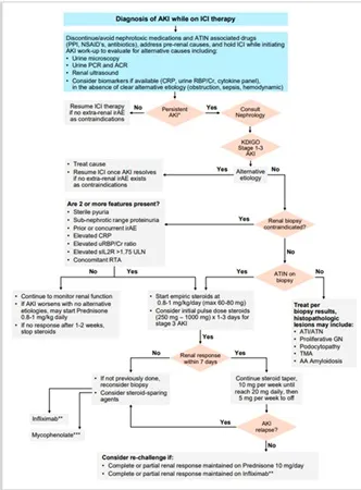 Algoritmo terapêutico para IRA associada a inibidores de checkpoint imune (ICI-AKI). Adaptado com permissão de Barbir et al.⁶⁷* Considera-se injúria renal aguda (IRA) persistente aquela com duração superior a 72 horas, conforme os critérios da KDIGO. ** Infliximabe é o agente poupador de corticoide preferido para tentativa inicial, segundo os autores. *** Como o micofenolato é um agente antiproliferativo, ele é a opção menos preferida pelos autores para tratamento de nefrite túbulo-intersticial associada ao ICI que seja dependente ou refratária ao corticoide, pois pode interferir na eficácia antitumoral do ICI. No entanto, em contextos com recursos limitados, pode ser a única opção disponível.
