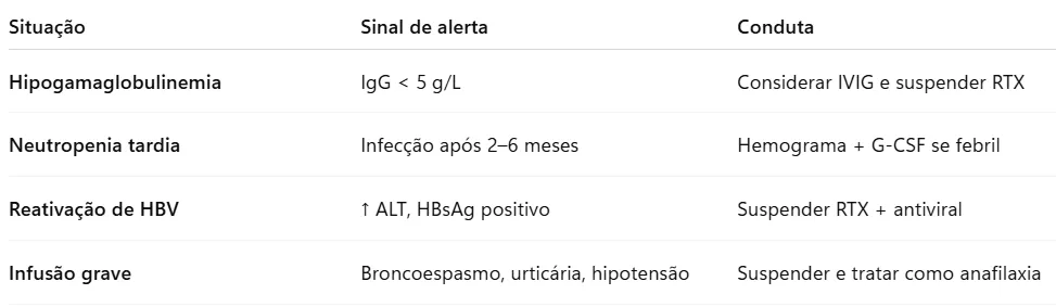 💡 Se IgG <5 g/L ou infecções recorrentes → suspender rituximabe e considerar IVIG.