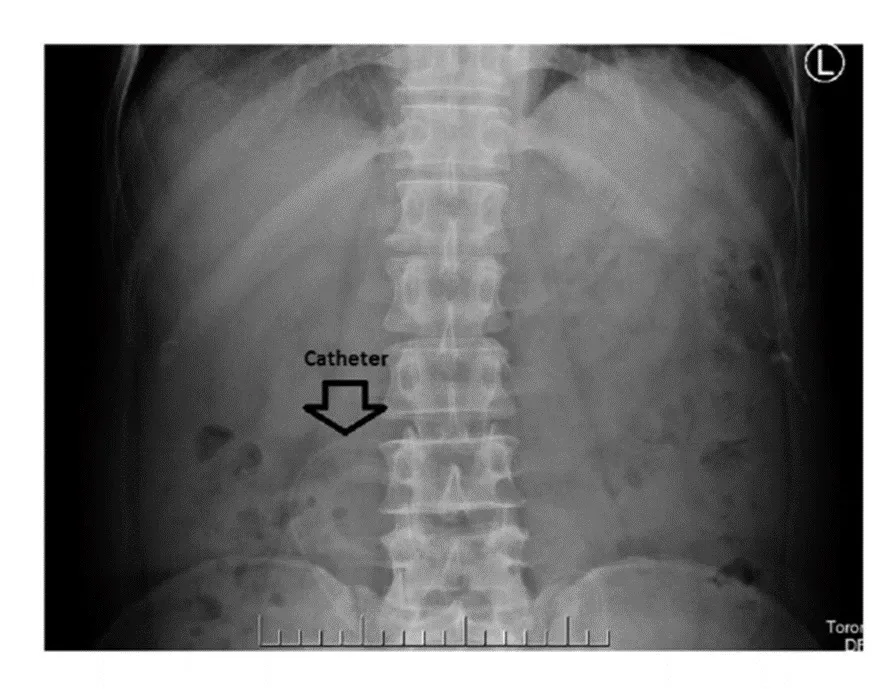 * Constipação com migração da ponta do cateter para fora da pelve; Deve-se tratar a constipação e, se falha, em retornar a ponta do cateter para a posição correta, considerar reposicionamento da ponta do cateter.