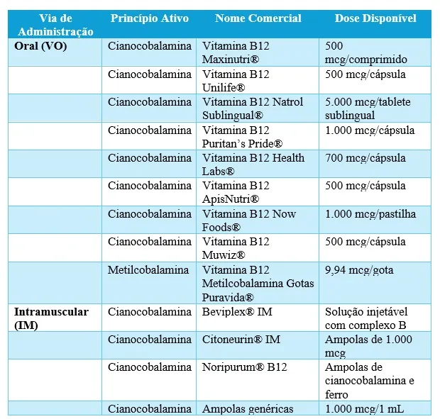 * Cianocobalamina 500 mcg e 1.000 mcg (comprimidos ou solução oral).
