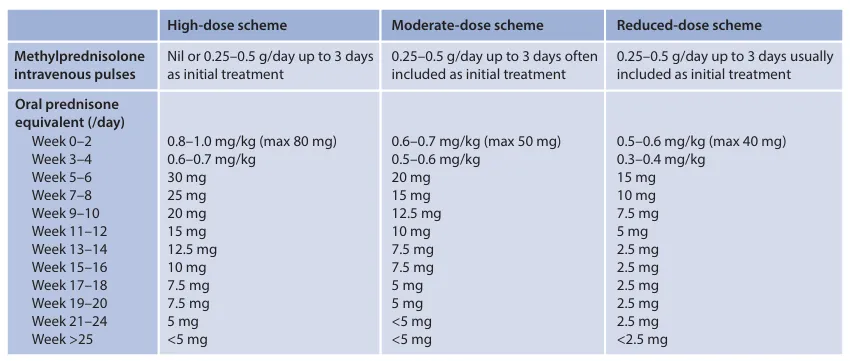 Regimes de corticoide em dose reduzida, após pulsos curtos de metilprednisolona, podem ser utilizados quando há resposta satisfatória renal e sistêmica.