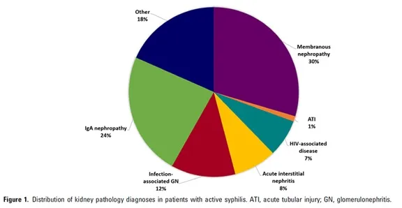 ❌ Nem todos os casos com doença renal em pacientes com sífilis tinham relação direta com a infecção. Diagnósticos como glomeruloesclerose diabética, paraproteinemias e necrose tubular aguda foram também identificados.