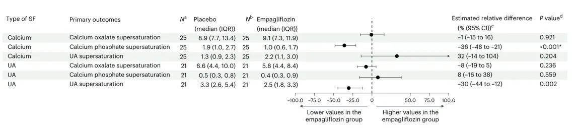 * A empagliflozina reduziu em 36% o índice de supersaturação de fosfato de cálcio comparado ao placebo (P<0,001).