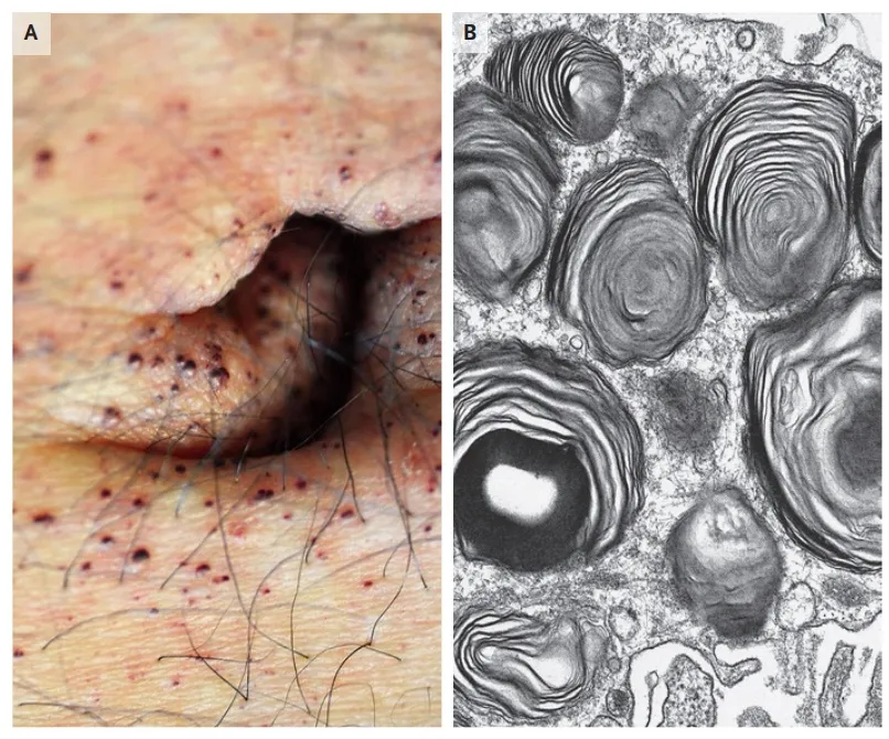 O exame físico acrescentou uma pista importante:** lesões vasculares periumbilicais com longa evolução, compatíveis com angioceratomas (Figura 1).** Embora isoladamente não conclusivos, em conjunto com as manifestações clínicas sugeriam a possibilidade de uma doença sistêmica de depósito.