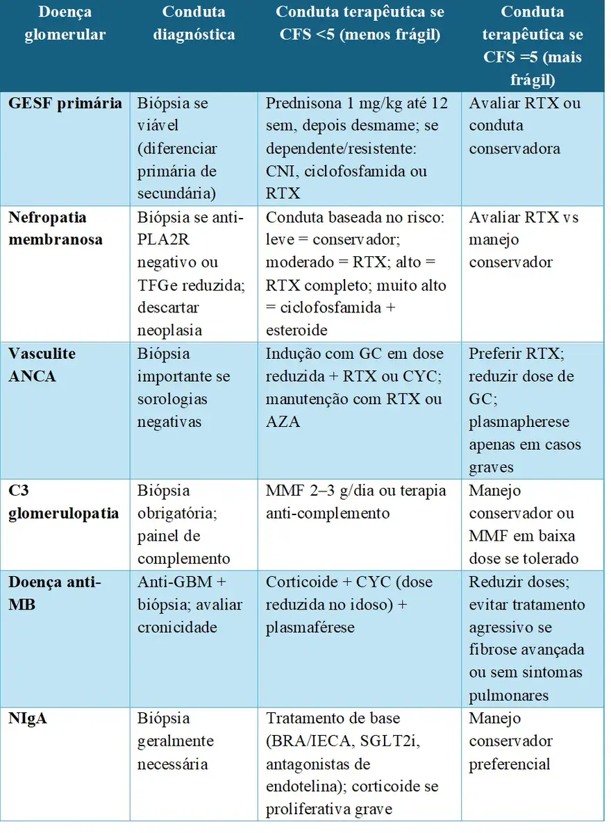 **Referência**: Wiegley N, Jhaveri KD, Corona A, So P, Jain K. How I treat glomerular diseases in older adults. CJASN. 2025. [**[link](https://pubmed.ncbi.nlm.nih.gov/40587222/)**]