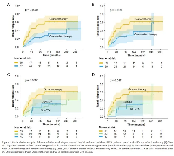 * Monoterapia com GC → maior risco de recidiva renal (HR 2,71; IC95% 1,28–5,75; p=0,009).