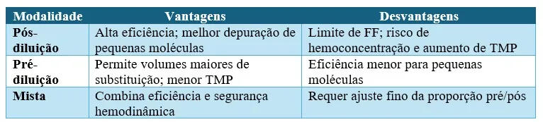 - **Fração de Filtração (FF):** na pós-diluição, manter ≤ 25% (0,25) para evitar hemoconcentração excessiva; na modalidade mista, pode-se tolerar FF mais alta na parte pré.