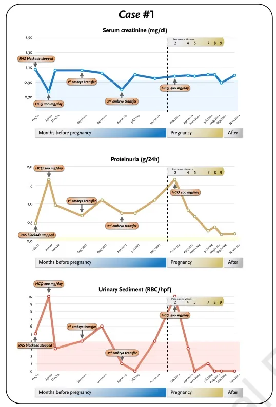 Paciente de 33 anos, inicialmente com proteinúria nefrótica, previamente controlada sem imunossupressão. Após suspensão de anti-hipertensivos antiproteinúricos para engravidar, teve piora da proteinúria. HCQ foi iniciada como medida preventiva. Após interrupção equivocada da HCQ durante a gestação, observou-se piora da proteinúria, com nova melhora após reintrodução. Evoluiu com parto a termo e boa tolerância ao medicamento.