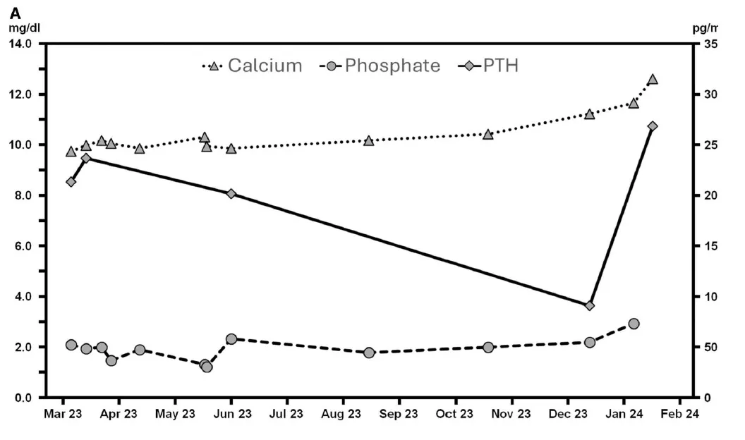 medicamentos. Recentemente, o paciente tinha apresentado hipercalcemia progressiva com hipofosfatemia concomitante e níveis elevados de paratormônio (PTH).