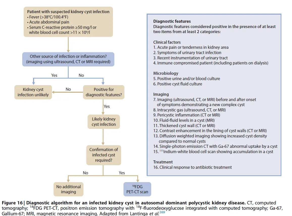 O novo fluxograma da KDIGO 2025 (**[link](https://kdigo.org/wp-content/uploads/2025/01/KDIGO-2025-ADPKD-Guideline.pdf)**) ajuda a estruturar o diagnóstico e a condução desses casos, reconhecendo que, muitas vezes, os achados clínicos e de imagem se sobrepõem a outras causas de dor ou febre.