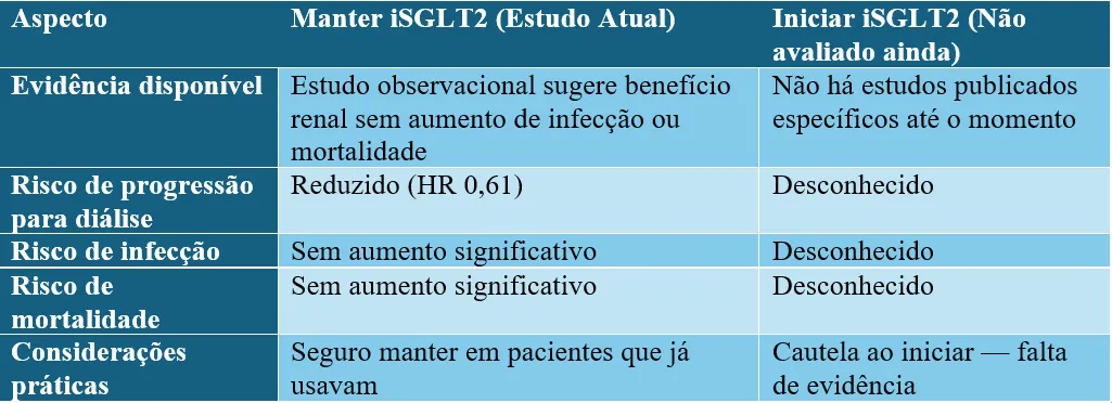 Se o paciente com diabetes tipo 2 já usava iSGLT2 e atingiu DRC estágio 5, manter a medicação pode retardar a progressão para a diálise, sem aumento do risco de infecções ou mortalidade. Trata-se de uma evidencia relevante na prática, embasada em dados observacionais robustos. No entanto, ainda aguardamos mais estudos, especialmente ensaios clínicos randomizados, para validar o início de iSGLT2 nesta fase. Estamos aguardando a publicação do estudo em que foi usado dapagliflozina 5 mg nestes pacientes e que foi apreesntado no congersso americano de San Diego 2024.