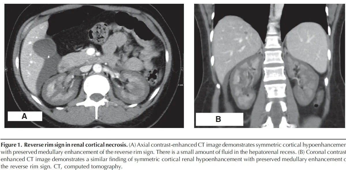A NCR é uma forma grave e frequentemente irreversível de lesão renal isquêmica, resultante de uma redução prolongada da perfusão arterial renal. Esta condição é geralmente associada à CIVD e apresenta-se com início abrupto de oligúria ou anúria, algumas vezes acompanhada de hematúria macroscópica e dor no flanco. A TC com contraste mostrou a preservação da medula renal e a hipocaptação cortical (rim reverso), confirmando o diagnóstico de NCR.