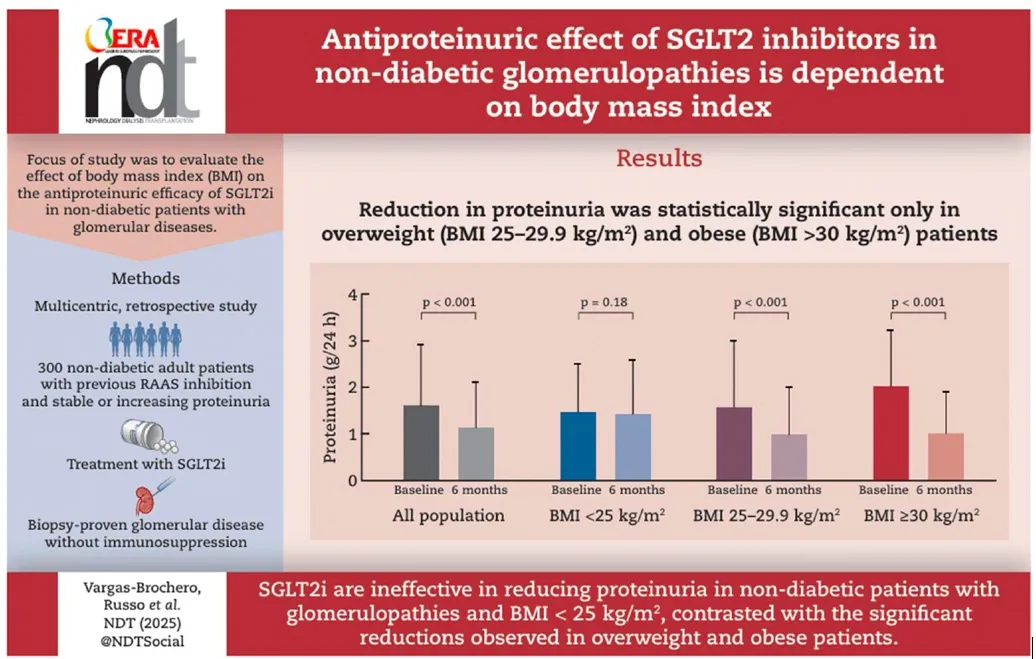 Vargas-Brochero MJ, et al. An proteinuric effect of SGLT2 inhibitors in non-diabetic glomerulopathies is dependent on body mass index. Nephrol Dial Transplant. 2025. [**[link](https://academic.oup.com/ndt/advance-article/doi/10.1093/ndt/gfaf197/8263928?login=false)**]