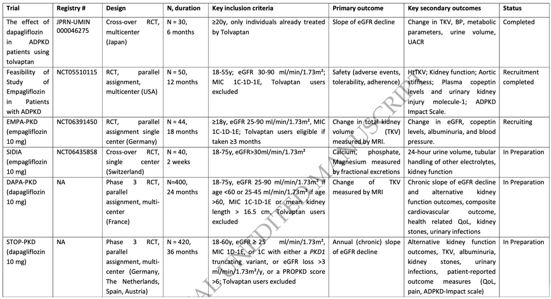 1. DAPA-PKD: coordenado na França, vai recrutar 400 pacientes e avaliar impacto sobre o volume renal por ressonância.