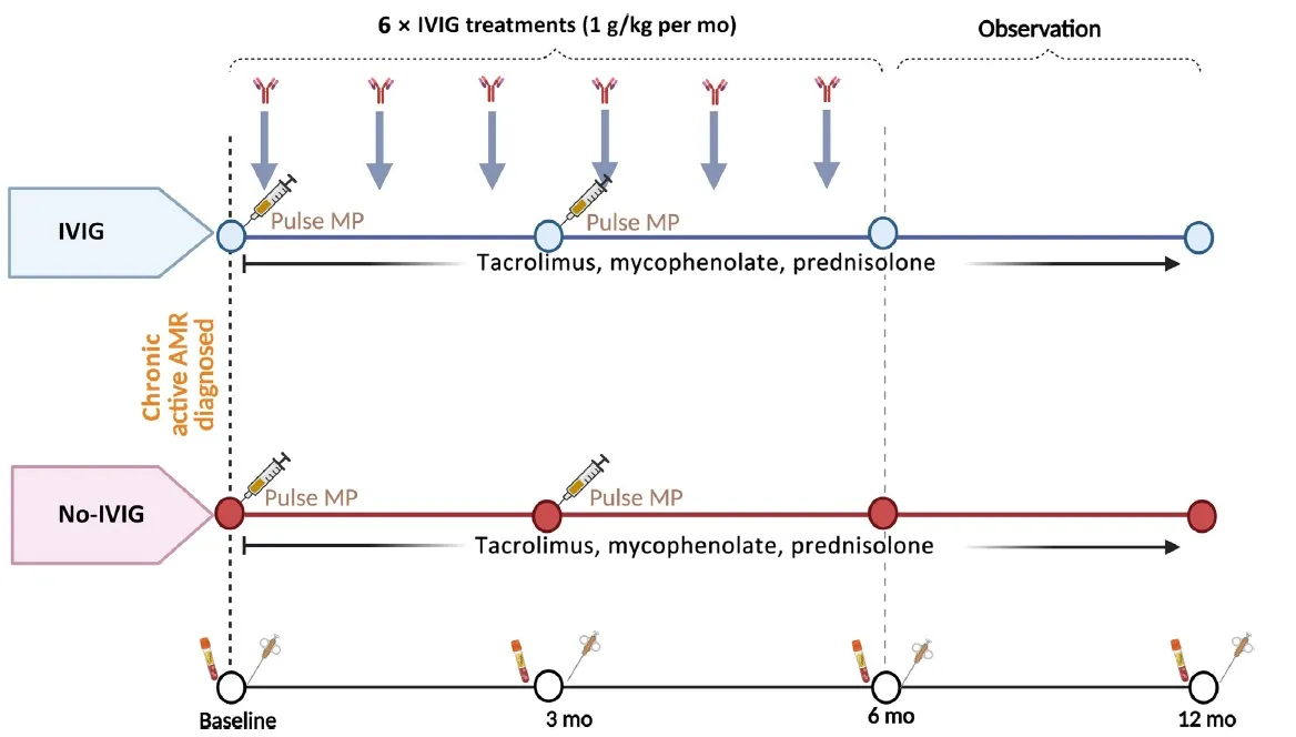 * **Intervenção**: IVIG 1 g/kg/mês × 6 meses vs. controle (sem IVIG), todos em imunossupressão padrão.