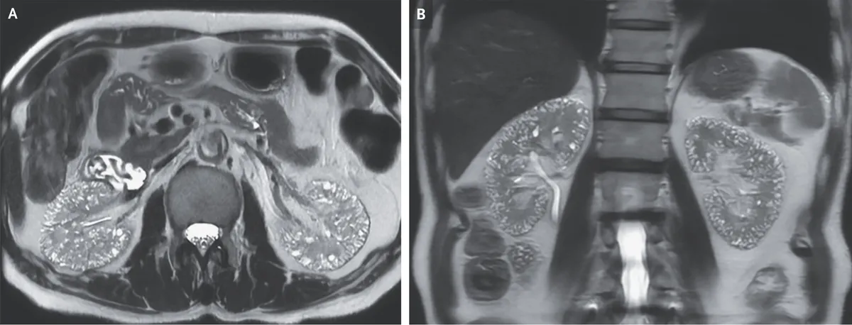 O paciente negava qualquer histórico familiar de doença renal cística. A RM ponderada em T2 revelou numerosas microcistos localizados no córtex e na medula de ambos os rins (Imagem abaixo - Painel A, corte axial; Painel B, corte coronal).
