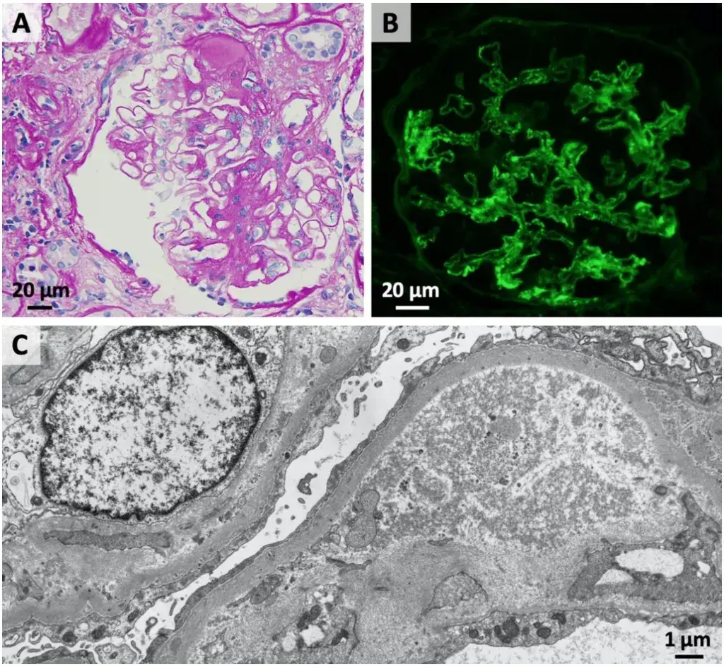 A microscopia de luz revelou glomérulos com lesões insudativas, hialinização arteriolar e proliferação mesangial (Figura 1A), mas **nenhuma** lesão ativa da nefrite lúpica foi identificada. A imunofluorescência mostrou **apenas** deposição linear de IgG ao longo da membrana basal glomerular com escassa deposição granular (Figura 1B). A microscopia eletrônica demonstrou apagamento do processo podocitário e espessamento da membrana basal.