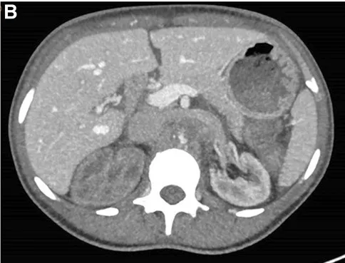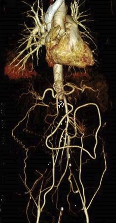 A TC também revelou importante circulação colateral na parede abdominal, permitindo suprimento sanguíneo suficiente para os membros inferiores. Apenas o rim esquerdo mostrou captação residual de contraste (Figura 1), sugerindo rim direito isquêmico.