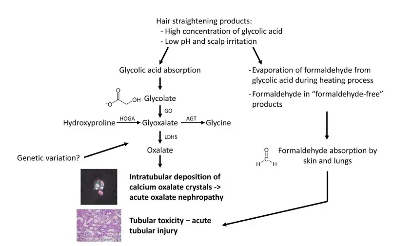 Produtos contento derivados do ácido glicólico são metabolizados para oxalato, logo, quando em excesso, pode ocorrer nefrotoxicidade por lesão tubular com deposição de cristais de oxalato de cálcio nos túbulos renais, causando assim a Nefropatia por Oxalato.