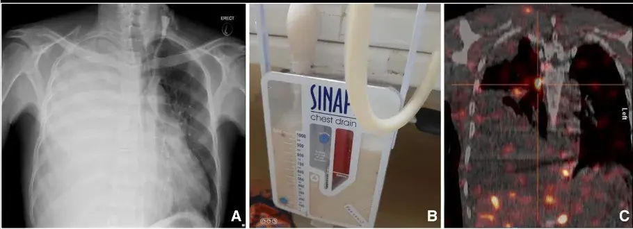 A-Rx de tórax indicando derrame pleural volumoso a direita. B-Drenagem de liquido quiloso. C-TC tórax com radioisótopo radioisótopo 99mTc indicando vazamento linfático hemitórax direito.