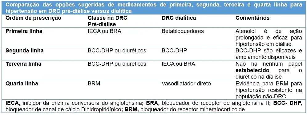 No cenário de DRC pré-diálise e na ausência de indicações específicas para outras drogas, nossa prática é prescrever um IECA ou BRA como terapia de primeira linha para hipertensão de acordo com as recomendações recentes da AHA/ACA para pacientes com DRC estágio 3 ou superior ou aqueles com albuminúria de pelo menos 300 mg/d ou 300 mg/g de creatinina. Em nossas mãos, a terapia de segunda linha é entre um BCC ou um diurético, com este último escolhido se o paciente tiver sinais de sobrecarga de volume ou se julgarmos que um BRM (bloqueadores dos receptores mineralocorticóides) será necessário para controlar a proteinúria descontrolada e deseja diminuir o potássio antes de iniciar o BRM.