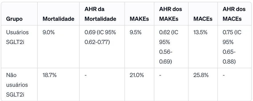 Para a comparação, um número igual de pacientes não usuários de iSGLT2 foi pareado por índice de propensão, e os riscos de morte (desfecho primário), eventos cardiovasculares adversos maiores (MACE) e eventos renais