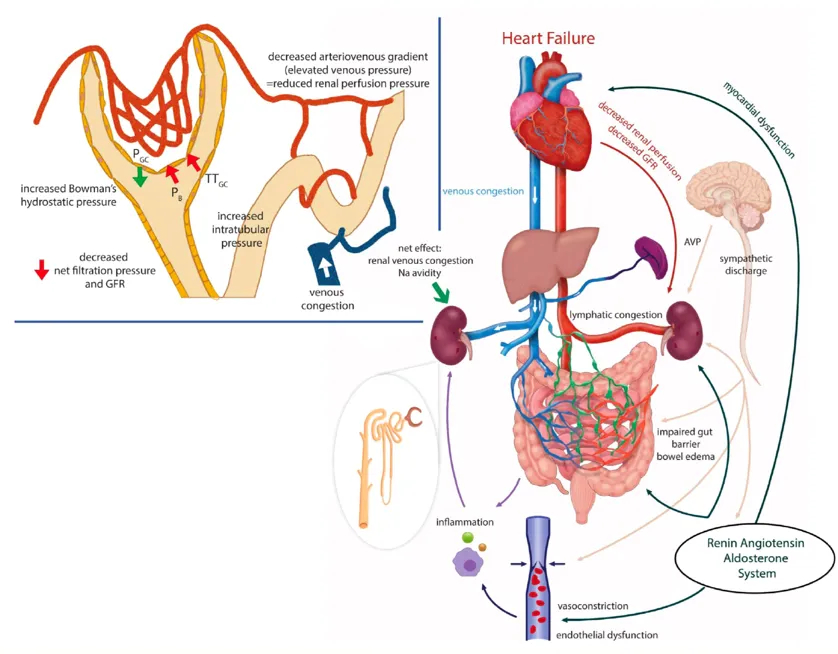 Essa pressão venosa elevada também é transmitida aos túbulos renais, causando aumento da pressão intratubular e, consequentemente, redução do gradiente de pressão hidrostática através da cápsula de Bowman, o que tem como efeito final a diminuição da taxa de filtração glomerular por néfron.O aumento da pressão venosa ainda sobrecarrega a compensação linfática renal, limitando a capacidade de drenagem e agravando a congestão. Por fim, o sistema neuro-hormonal — especialmente o sistema renina–angiotensina–aldosterona (SRAA) e o sistema nervoso simpático (SNS) — desempenha papel central na indução e manutenção do estado de retenção de sódio, perpetuando o ciclo vicioso da congestão.