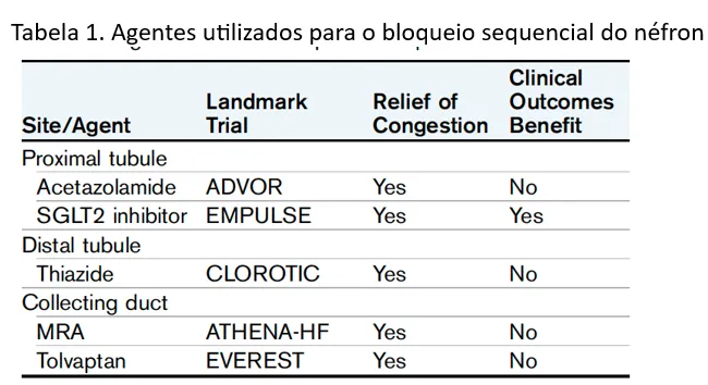 A estratégia é o bloqueio sequencial do néfron — combinando diuréticos de alças e tiazídicos (metolazona, clortalidona, hidroclorotiazida) ou acetazolamida (ADVOR trial).