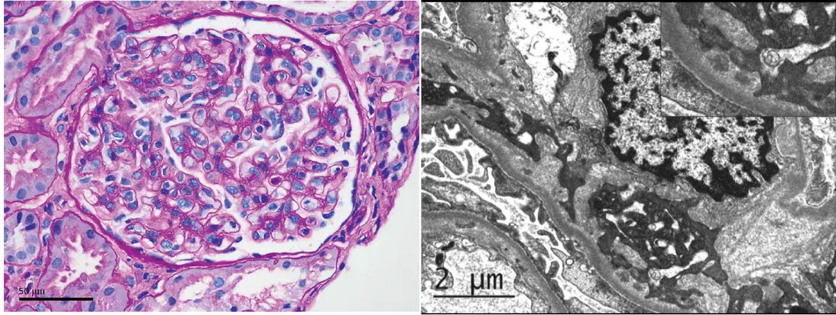 Pela clínica, a hipótese inicial de Nefropatia por IgA nefropatia ou GN pós-infecciosa parecia plausível. Foi procedido bióspia renal.